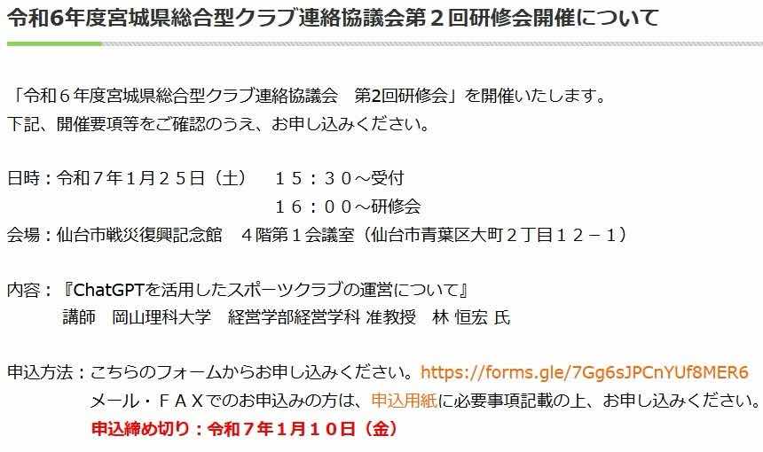 令和6年度宮城県総合型クラブ連絡協議会第2回研修会にて、ChatGPTを活用したスポーツクラブの運営について講師を務めます!