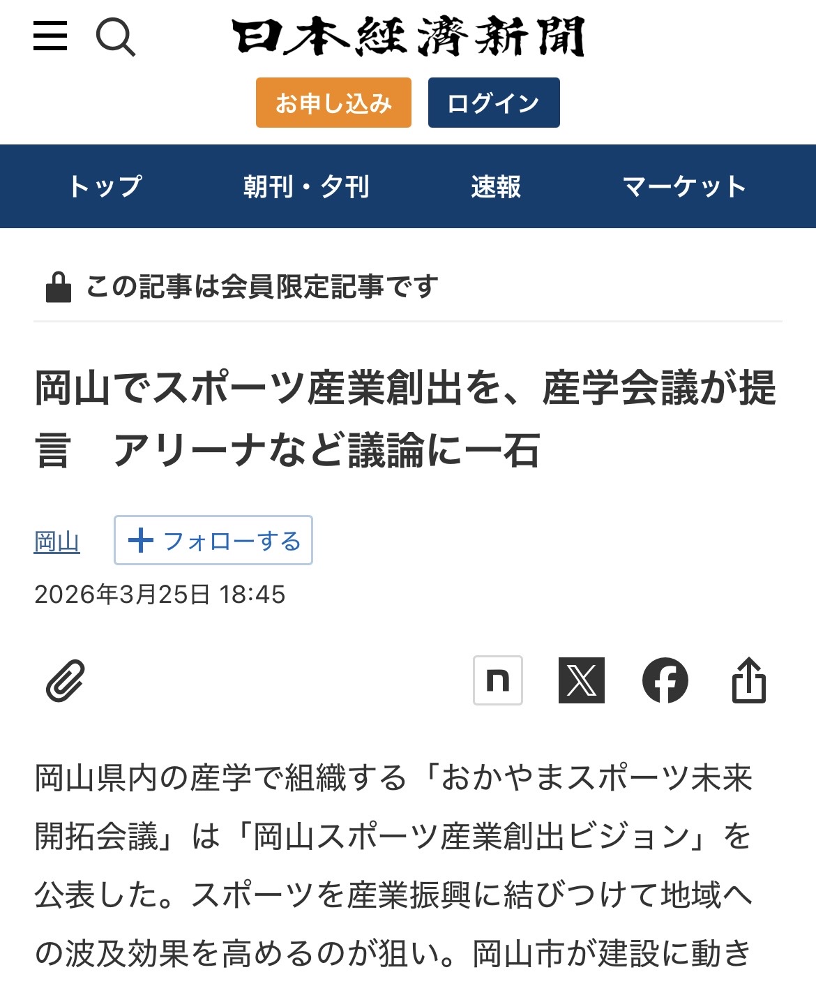 先日発表した「おかやまスポーツ未来開拓会議ビジョン」ですが、日本経済新聞でも紹介いただきました!